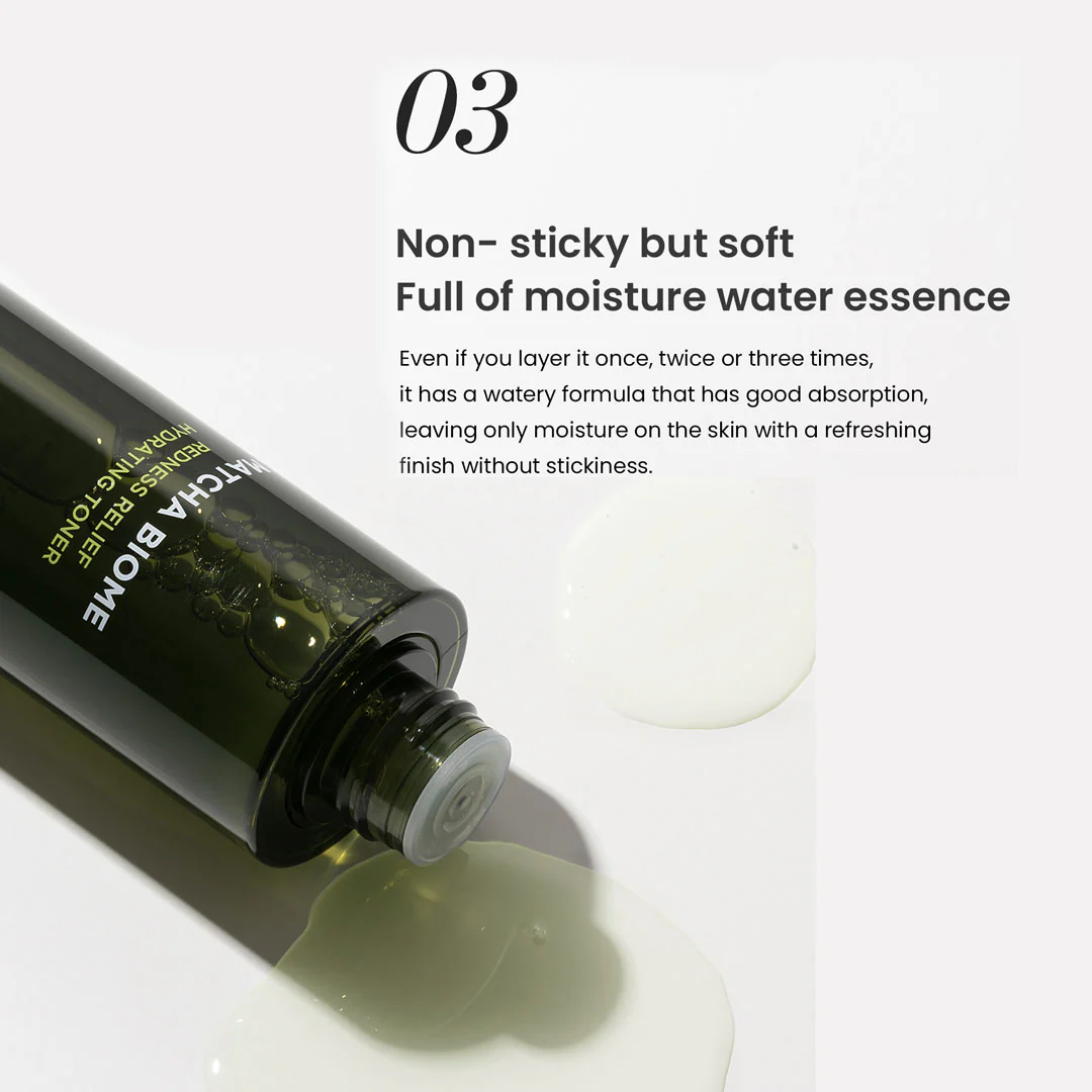 Watery essence toner containing matcha extract, probiotics and hypoallergenic ingredients to improve skin texture and vitality.